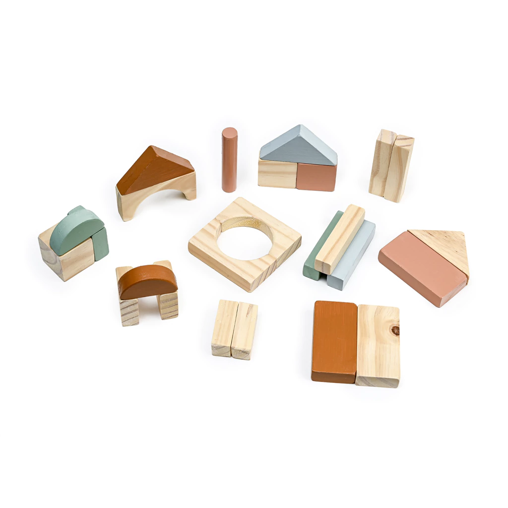 Set de 24 bloques de madera maciza de pino de formas y tamaños variados ideales para dejar volar la imaginación y construir lo que más les guste.